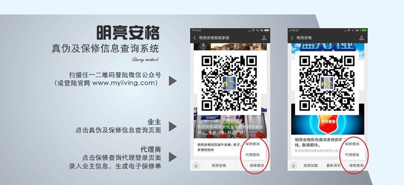 明亮安格公司緊跟時代發(fā)展,建立電子保修服務系統(tǒng),全國連網(wǎng)數(shù)據(jù)庫支持,正品保證,手機上即時錄入與查詢,讓安裝信息一目了然,可以為客戶提供更優(yōu)質(zhì)服務的同時,使客戶更有歸屬感,信任感。